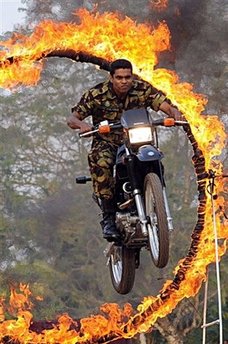 Fiery (火焰的, 炽热的, 热烈的) jump : Sri Lanka Police Special Task Force (STF) commandos (突击队) perform during a parade in Katukurunda, some 43 kms south of Colombo.