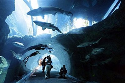 Mall sharks : Sharks swims past divers (潜水员) preparing the aquarium (水族馆) in the new Dubai Mall hours before its official opening in the oil-rich Gulf emirate (酋长国).