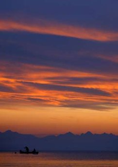 Two persons sit in a boat during sunset over the Alps at the Ammersee lake in Herrsching, about 30 kilometres southwest of Munich, November 2, 2008.