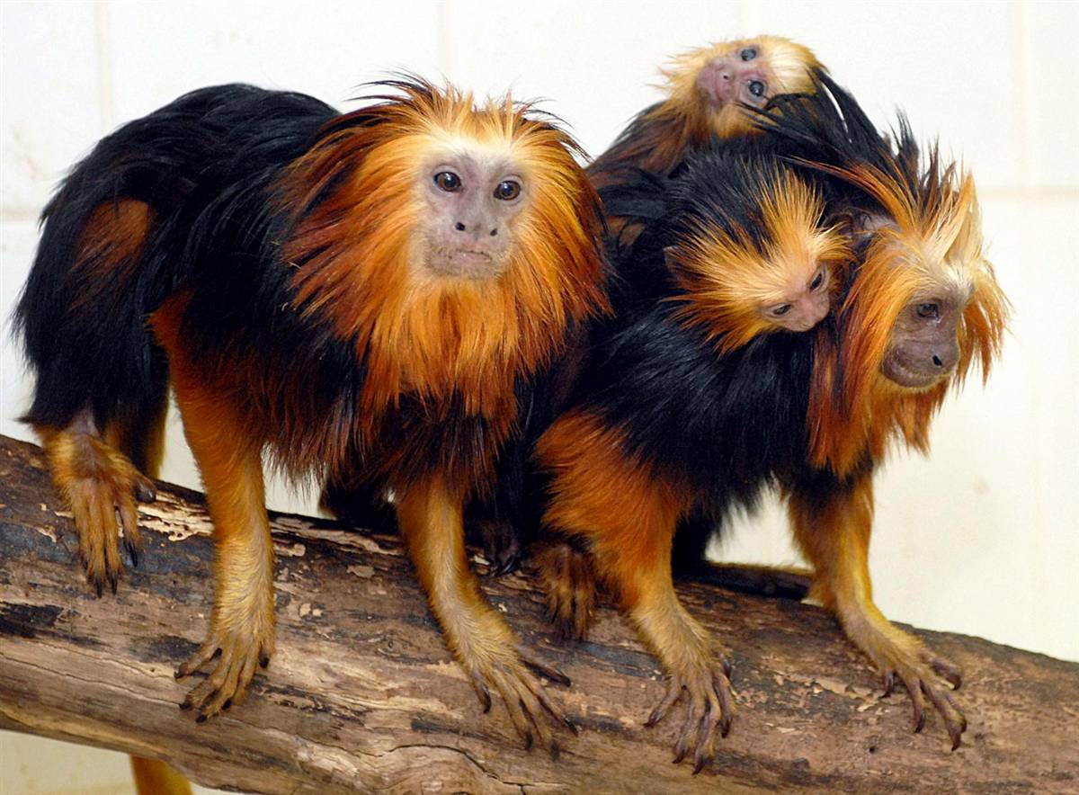Baby golden-headed lion tamarins(绢毛猴) hold on to their mother as their father looks on in their enclosure in the Tropicarium Zoo in Budapest, Hungary. The twins are about 3 weeks old. This highly endangered species is native in the rain forests of the eastern Brazilian states of Bahia and Minas Gerais.