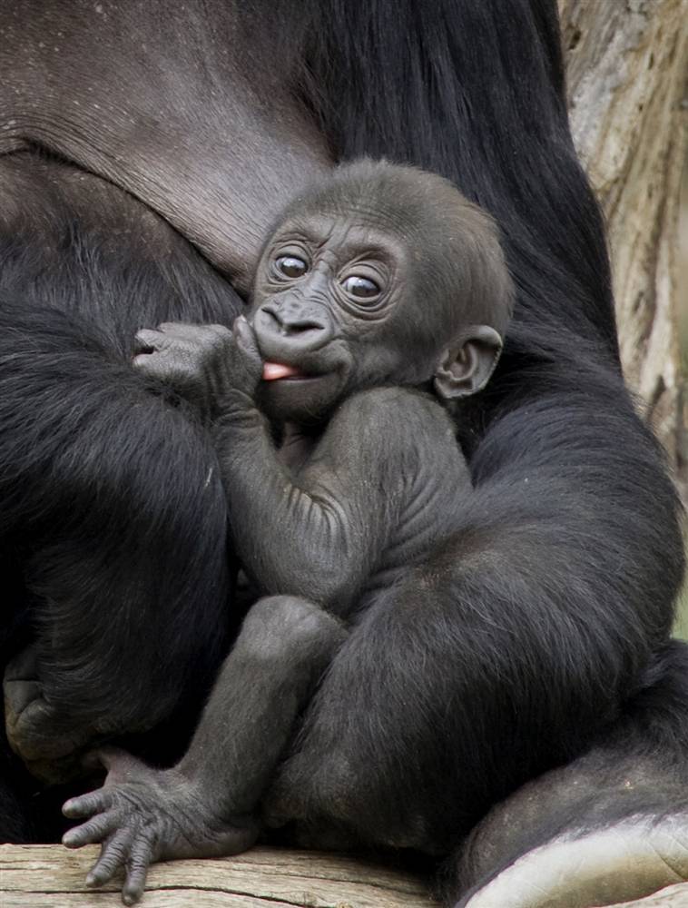 Kibibi, a 2 1/2-month-old female western lowland gorilla(大猩猩), sits in her mother's arms at the Smithsonian National Zoo in Washington, D.C. More than 10,000 people voted in a public contest held by the Zoo and the Friends of the National Zoo to choose her name, which means "little lady" in Swahili.