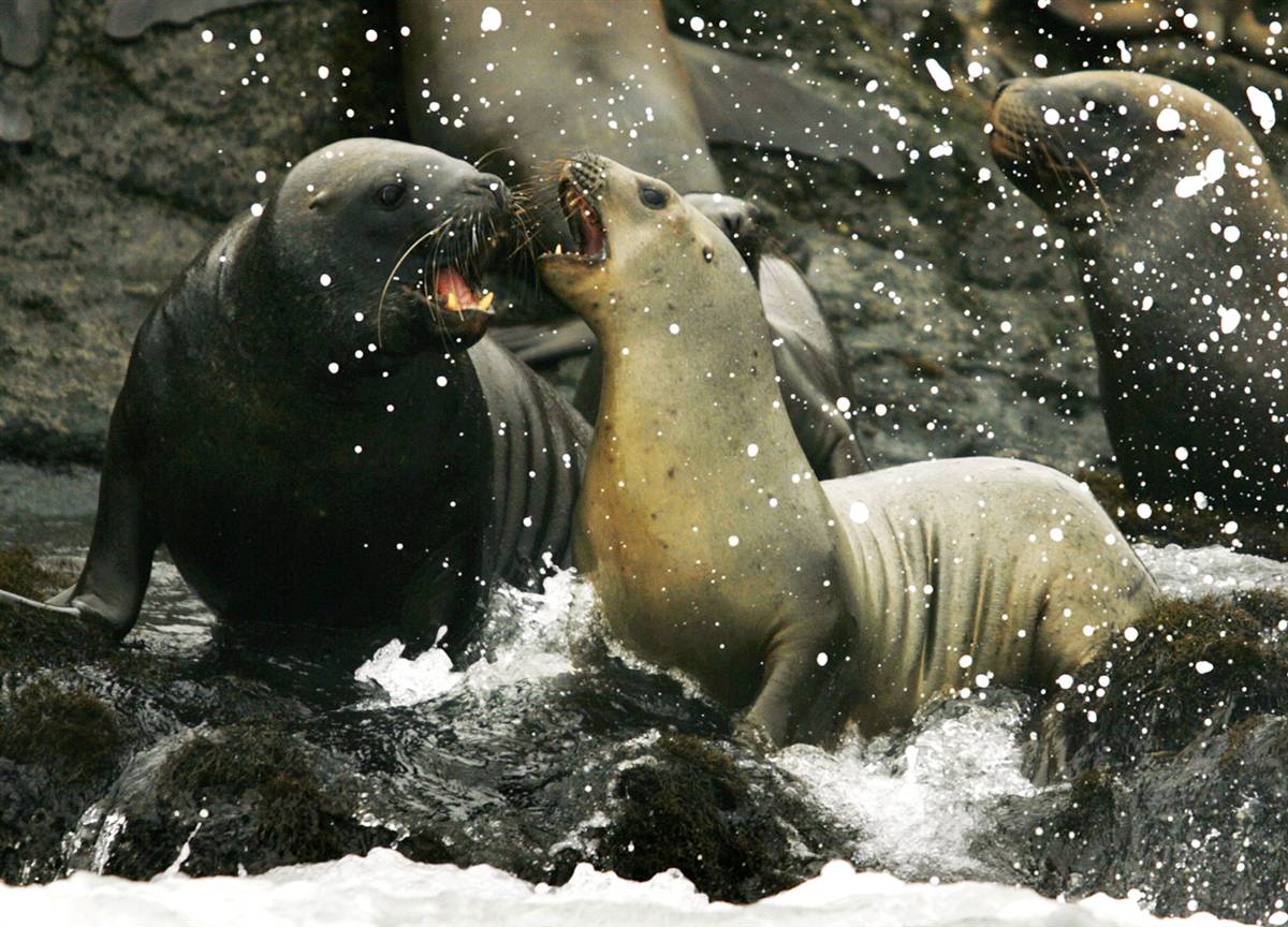 Two sea lions play on the Palomino Islands, some 5 miles from Callao's port on in Peru. In certain periods of the year, the islands house about 8,000 sea lions, making it one of the biggest colonies of these animals on the shores of Peru.