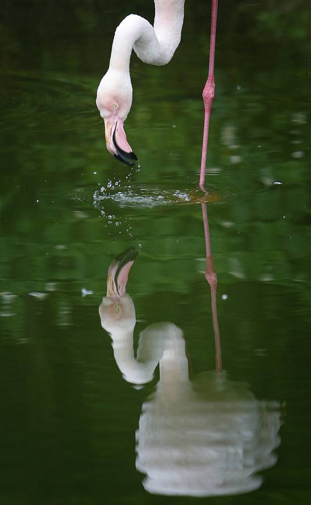 A flamingo(火烈鸟) takes a drink inside its enclosure at the Taipei City Zoo in Taiwan.