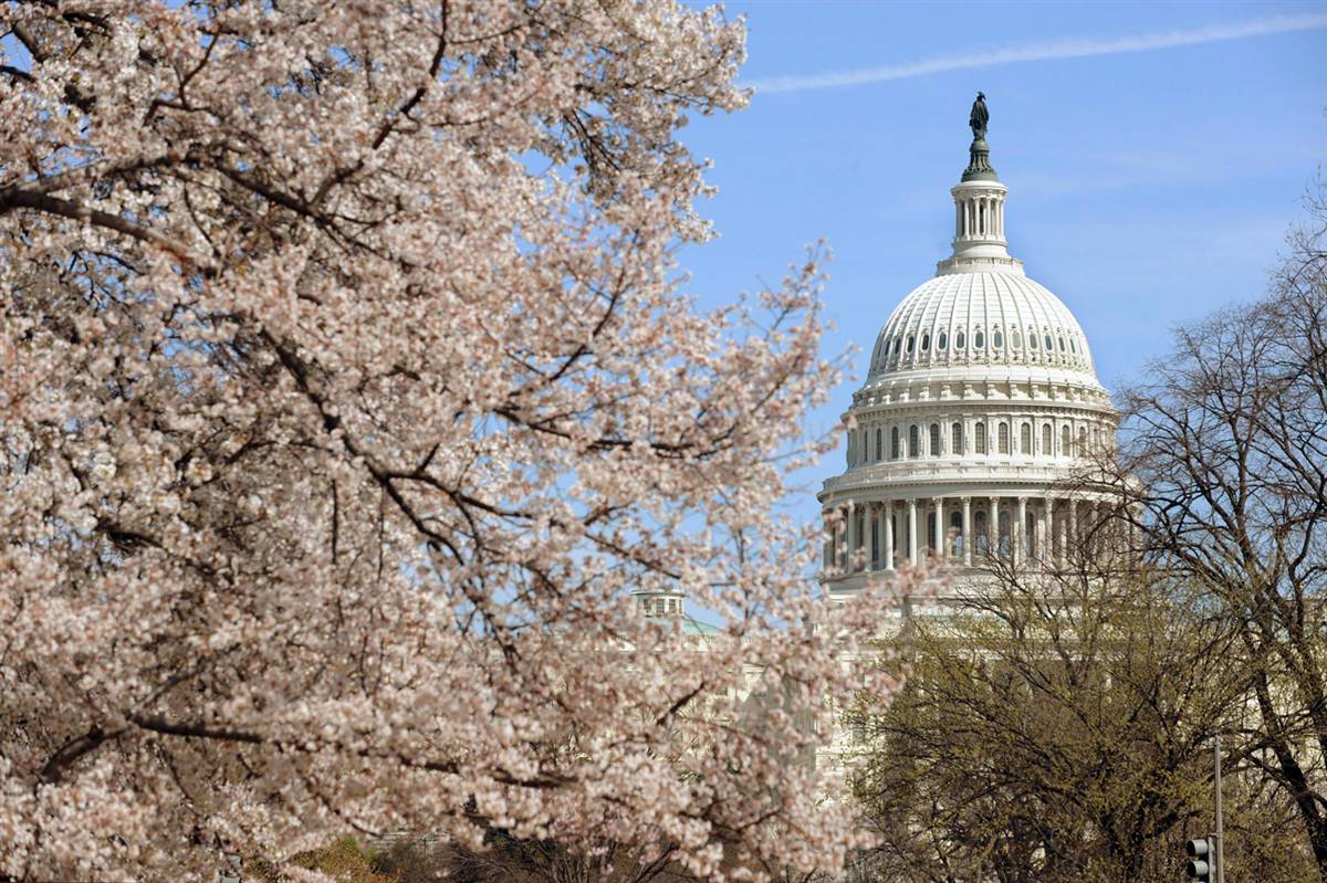 A general view of the United States Capitol Building behind Cherry tree blossoms in Washington D.C. Washington's annual Cherry Blossom Festival continues with cherry blossoms expected to peak this week.
