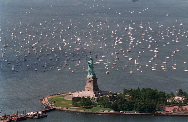 From 1984 to 1986, the statue remained closed to public for restorations in preparation for its centennial, a project that cost $62 million. In this picture taken a day before the grand reopening, small sailing ships and pleasure boats gather to to observe the celebrations.