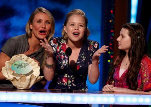 Cameron Diaz,(卡梅隆·迪亚兹) left, Sofia Vassilieva(索非娅·瓦萨列娃) and Abigail Breslin(阿比吉尔·布莱斯林) accept the award for Choice Summer Movie: Drama at the 2009 Teen Choice Awards.