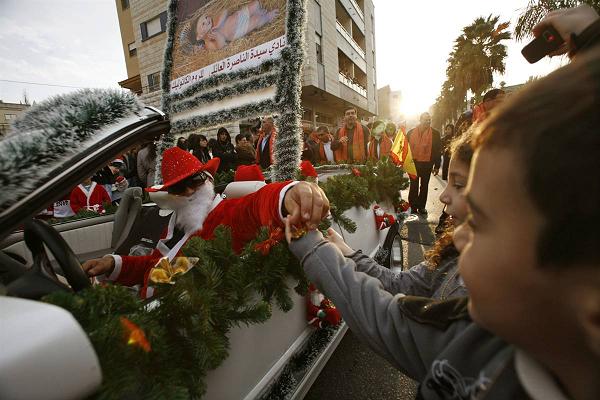 A man in a Santa Claus costume reaches out to Israeli Arab children during the annual Christmas procession(行队) in the northern town of Nazareth on Thursday.