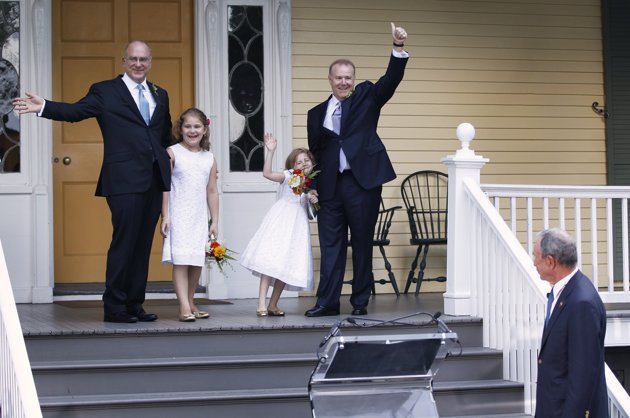 Jonathan Mintz (L), New York City's consumer affairs commissioner, and John Feinblatt (2nd R), a chief adviser to the mayor, celebrate their marriage with daughters Maeve (2nd L) and Georgia after being married by New York City Mayor Michael Bloomberg (R) at Gracie Mansion in New York July 24, 2011. Thousands of gay and lesbian New Yorkers are have been married this weekend, as the Empire State becomes the sixth in the U.S. to embrace same-sex marriage.