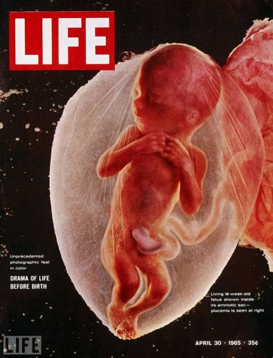 The still-astonishing April 30, 1965 LIFE cover image by the pioneering Swedish photographer Lennart Nilsson features an 18-week-old fetus(胎儿) inside its amniotic sac(羊膜囊). As the cover text notes, the color image of the fetus and placenta(胎盘) was a photographic breakthrough at the time, with LIFE proudly writing, "This is the first portrait ever made of a living embryo(胎儿) inside its mother's womb."