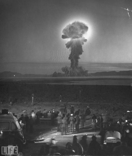 A gigantic(巨大的) cloud of radioactive dust rises from the desert floor in Nevada while seven miles away photographers -- including LIFE's J.R. Eyerman -- and other members of the press watch an A-bomb test in 1953.