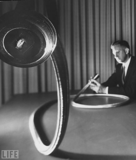 "Scientists have discovered a startlingly(令人吃惊地) ingenious(有天才的) way to transmit images around corners and a whole new American industry is being born." So LIFE wrote in its October 17, 1960 issue, discussing an innovation called "fiber optics(纤维光学)." Here, LIFE's Fritz Goro celebrates the breakthrough as Dr. Walter P. Siegmund, an optics specialist scientist, demonstrates.