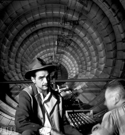 The industrialist, aviator, and film producer Howard Hughes sits with an engineer inside the cavernous(似巨穴的) sea plane, "the Spruce Goose," in Los Angeles on November 6, 1947. The Goose (made, in fact, primarily of birch, not spruce) was the largest flying boat ever built. J.R. Eyerman's portrait of Hughes inside his enormously ambitious invention -- the interior of which seems to recede into the distance, endlessly, behind him -- hints at not only the plane's monumental scale, but at Hughes' audacity as an engineer and a showman.