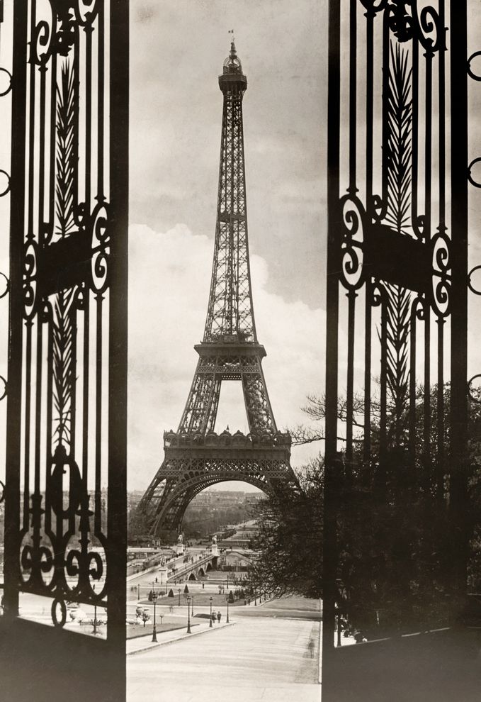 The gate of the Trocadero frames the Eiffel Tower in a July 1921 photograph.