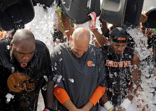 Cleveland Browns nose tackle Phil Taylor, left, head coach Mike Pettine, center, and cornerback Justin Gilbert get ice dumped over them after practice at NFL football training camp in Berea, Ohio Friday, Aug. 15, 2014. The Browns were challenged by the Baltimore Ravens to take the ALS Ice Bucket Challenge.