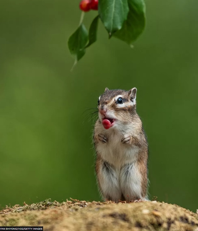 A chipmunk eats berries in Daqing, Heilongjiang Province, China.